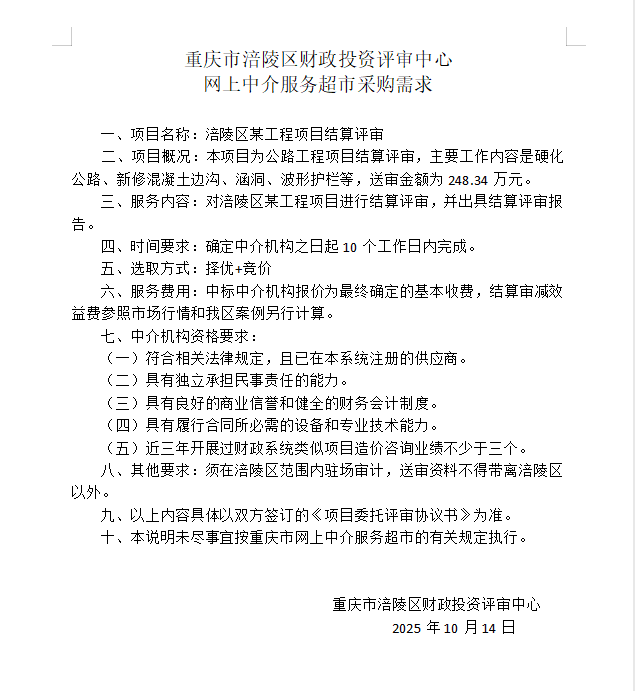 关于为【涪陵区某工程项目结算评审】 公开选取【工程造价咨询】机构的公告