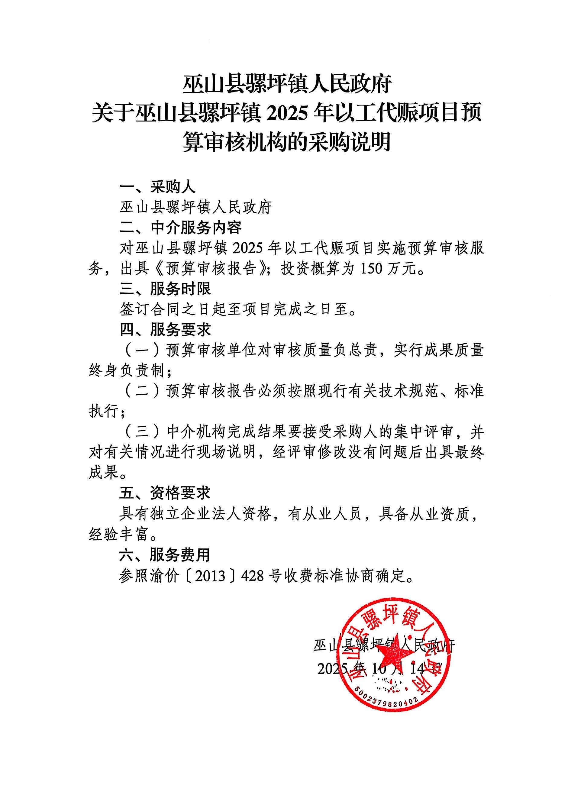 服务内容对巫山县骡坪镇2025年以工代赈项目实施预算审核服务,出具《预算审核报告》