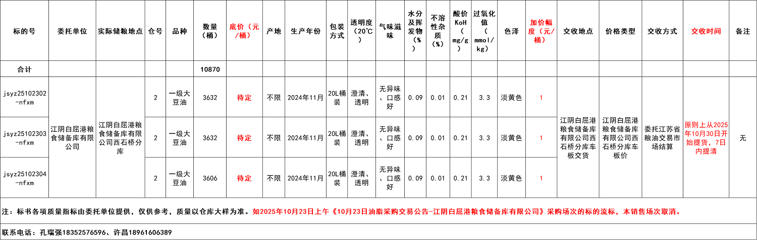 10月23日油脂销售交易公告-江阴白屈港粮食储备库有限公司